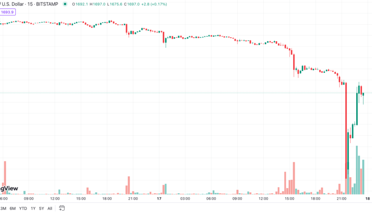 The news pushed ETH’s price back up 11% to $1,717 just 20 minutes after the market took a tumble two hours earlier.