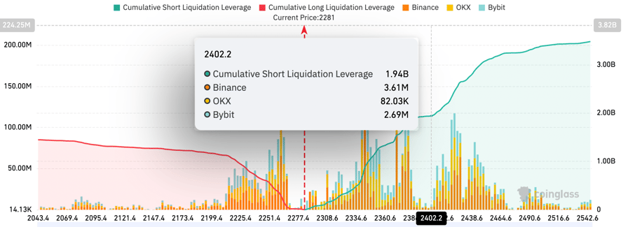 Meanwhile, Ether’s liquidation map reveals that a break above $2,400 would trigger over $1.94 billion in short liquidations across all exchanges.