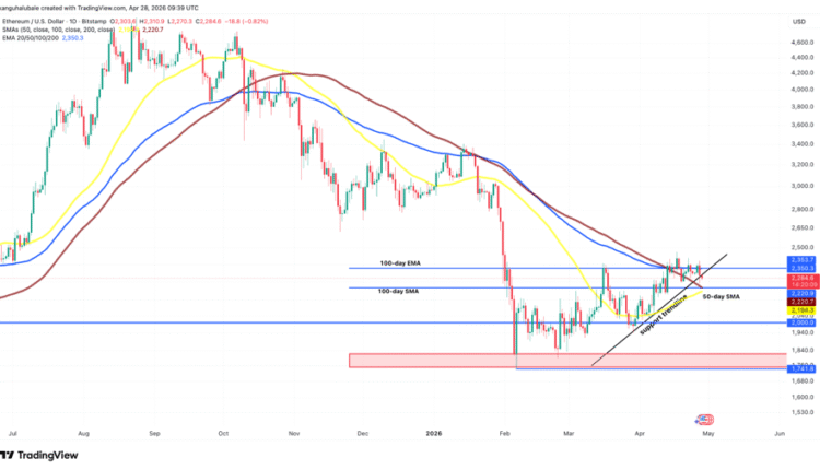 This meant that the price remained wedged between the 100-day exponential moving average at $2,350 and the 100-day simple moving average (SMA) at $2,220, as shown in the chart below.