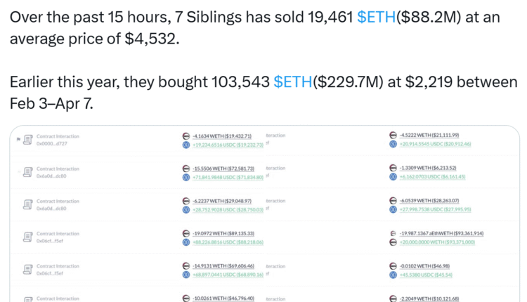 The mysterious Ethereum whale collective known as “7 Siblings” has offloaded $88.2 million worth of Ether over the past 15 hours.