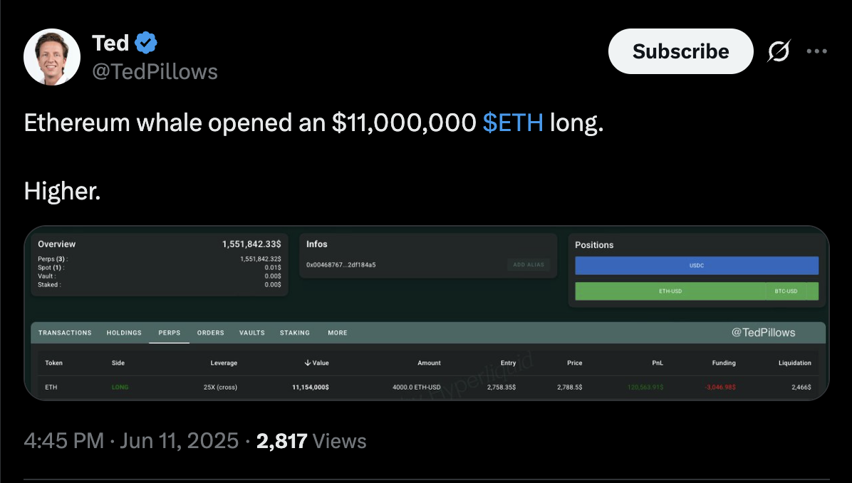 On June 10, an Ethereum whale opened a $11.15 million long position on ETH with 25x leverage, amounting to a 4,000 ETH bet placed at an entry price of $2,758.35.