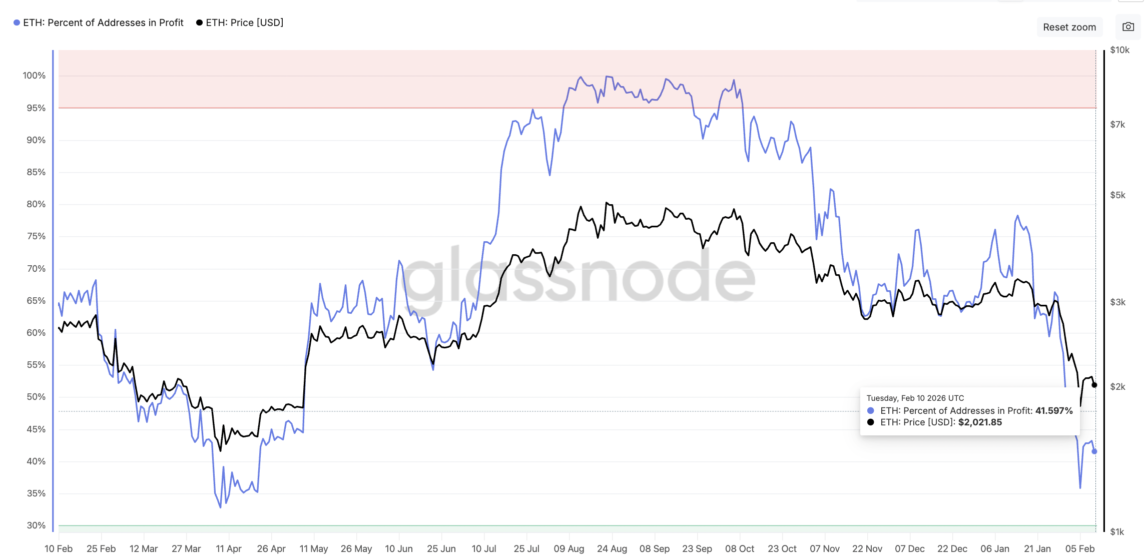 With ETH trading at $1,954 on Wednesday, only 41.5% Ethereum addresses are in profit, while over 58% are in the red.