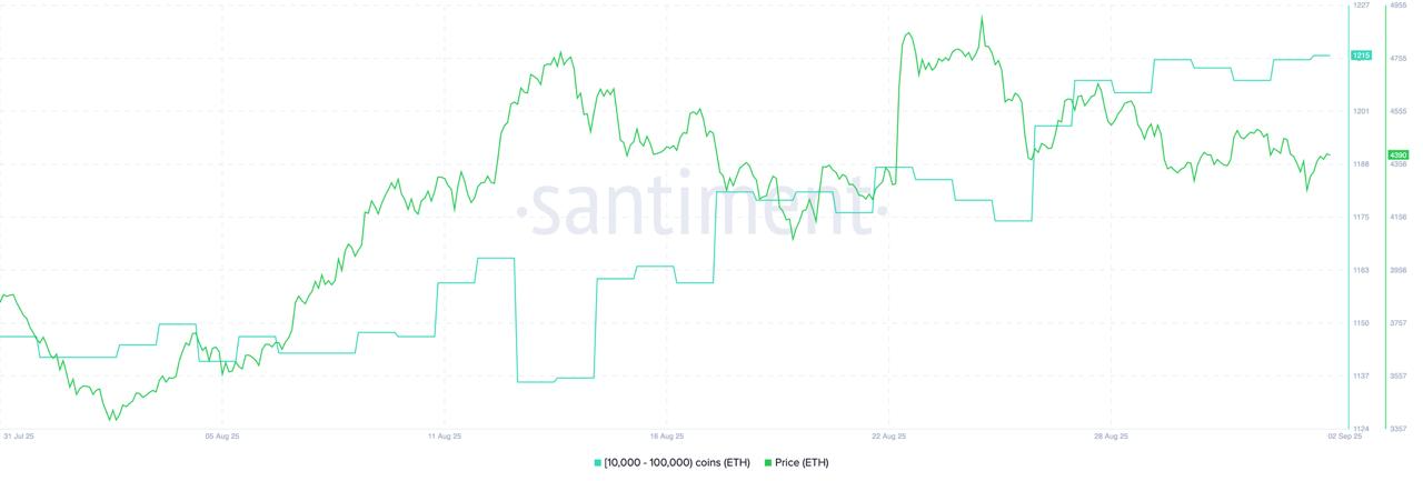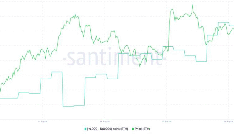 Data from Santiment shows that whale addresses holding between 10,000 and 100,000 ETH rose by 4% between Aug. 24 and Tuesday. Moreover, these big investors have accumulated about 260,000 ETH worth $1.14 billion in the past 24 hours.