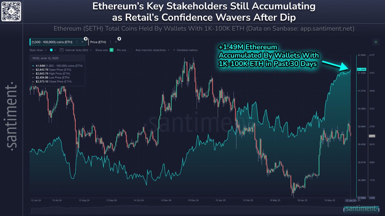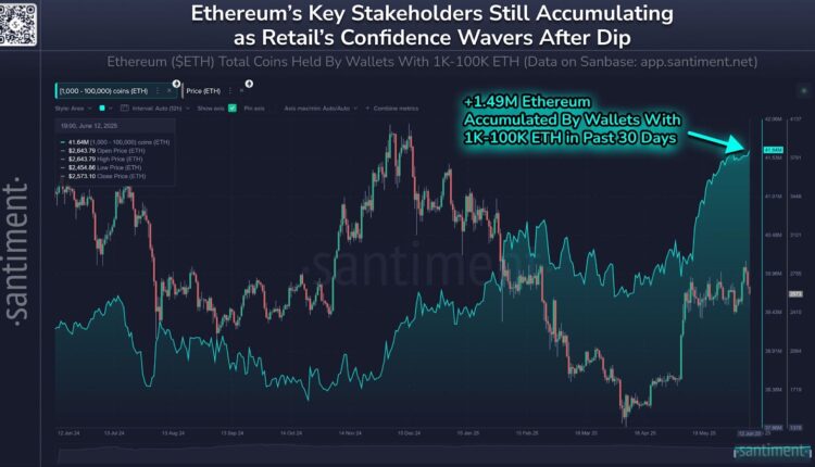Ethereum wallets holding between 1,000 ETH (whales) and 100,000 ETH (sharks) have added a net total of 1.49 million ETH (worth $3.79 billion) over the last 30 days, increasing their collective holdings by 3.72%, Santiment said in a X post on June 13.