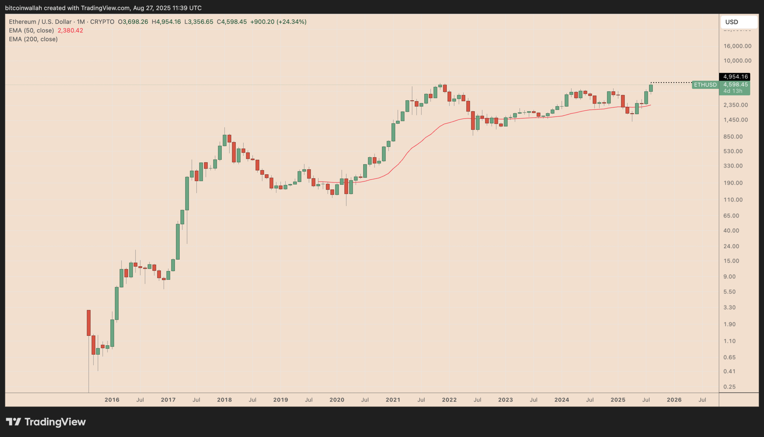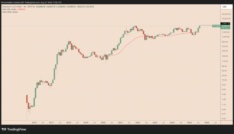 Ethereum’s native token, Ether (ETH), is on track for its highest monthly close, above the current record high of around $4,955.