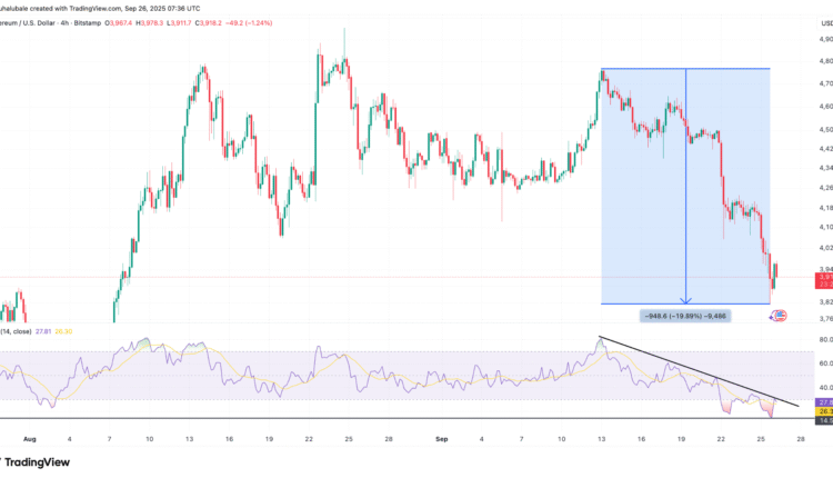 Ether’s 20% drop below $4,000 from $4,800 over the last two weeks has significantly impacted low-timeframe RSI.