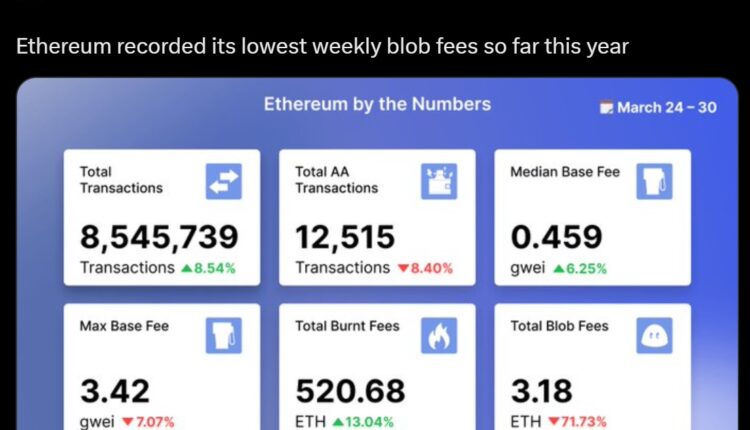 In the week ending March 30, Ethereum earned only 3.18 Ether (ETH) from blob fees, according to Etherscan, or approximately $6,000 US dollars as of April 1.