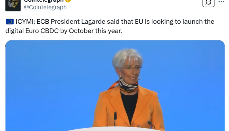 “The European Union is looking to launch the digital euro, our central bank digital currency, by October this year,” Lagarde said during a news conference, adding: