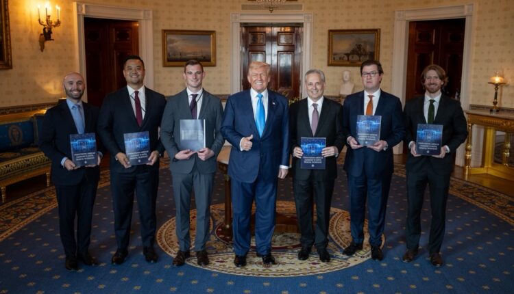 Bo Hines, pictured to the left of US President Donald Trump, who stands in the center, following the publication of the advisory group’s crypto report. Source: Bo Hines