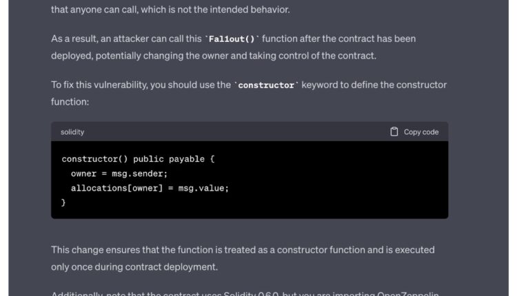 It’s important to note that ChatGPT and GPT-4 are LLMs developed for natural language processing, human-like conversations and text generation rather than vulnerability detection. With enough examples of smart contract vulnerabilities, it’s possible for an LLM to acquire the knowledge and patterns necessary to recognize vulnerabilities.
