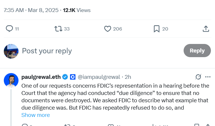 Grewal claimed the FDIC has also not fully cooperated with Coinbase’s documentation requests under the Freedom of Information Act (FOIA):