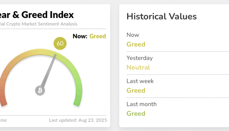 The Crypto Fear & Greed Index, which measures overall crypto market sentiment, rose to a “Greed” score of 60 on Saturday, up 10 points from Friday’s “Neutral” reading of 50, after briefly dipping into Fear earlier in the week.