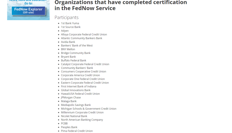 The Federal Reserve’s upcoming instant payment system, FedNow, released its list of certified “early adopters” on June 29. The organizations on the list have been certified as ready to connect with the platform when it launches in late July. No blockchain networks are on the list, despite at least two having previously announced that they would connect to the instant payment system.