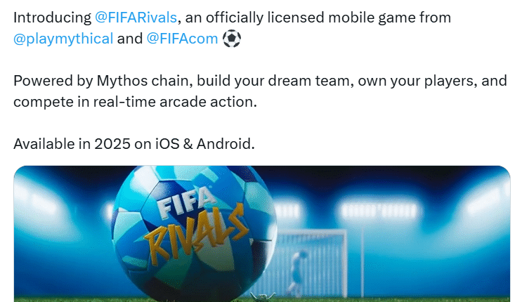 In November 2024, FIFA partnered with blockchain gaming studio Mythical Games to launch FIFA Rivals, a free-to-play soccer game for iOS and Android.