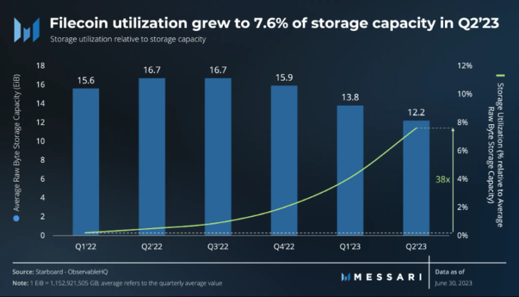 According to a July 13 report by Messari, Filecoin currently averages 954.2 pebibytes (1.07 billion gigabytes) worth of storage deals on its network, compared with 12.2 exbibytes (14.1 billion gigabytes) worth of raw storage capacity. Until recently, uptake had been sluggish due to high storage costs compared with centralized alternatives such as Amazon Web Services.