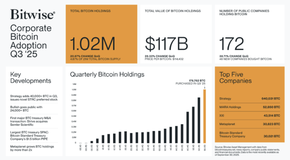In its Q3 Corporate Bitcoin Adoption Report, Bitwise found that 172 companies now hold Bitcoin on their balance sheets, with 48 of them emerging in the third quarter alone.