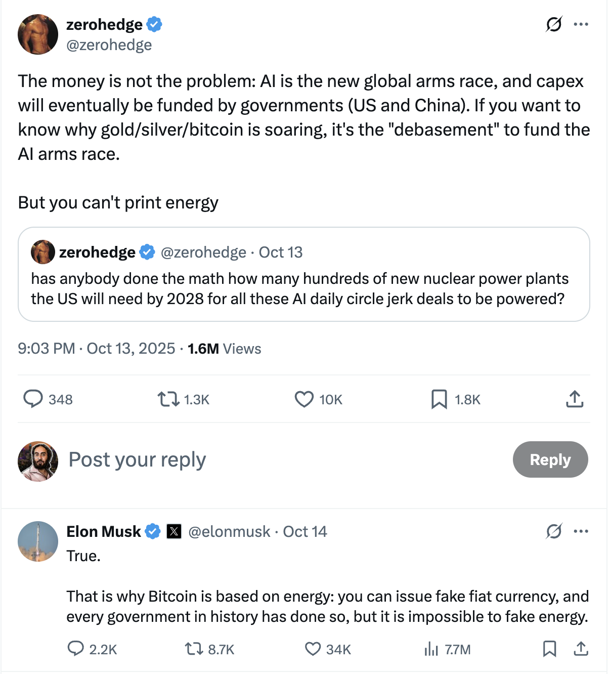 In a post on X, Musk highlighted Bitcoin’s energy-intensive proof-of-work system, describing it as “impossible to fake energy” — a contrast, he suggested, to government-issued currencies.