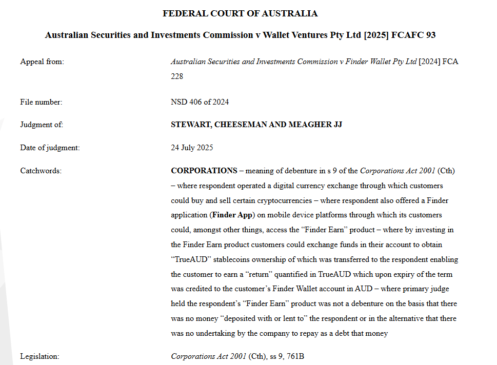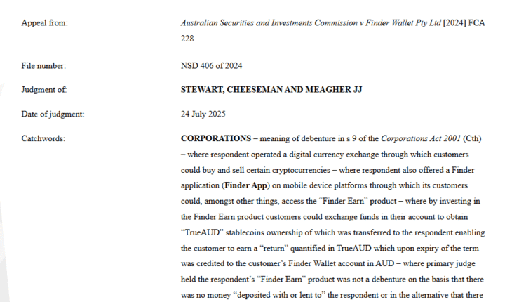 The case marked the first time that the legal definition of debenture had been tested in an Australian court concerning cryptocurrency, according to Finder.