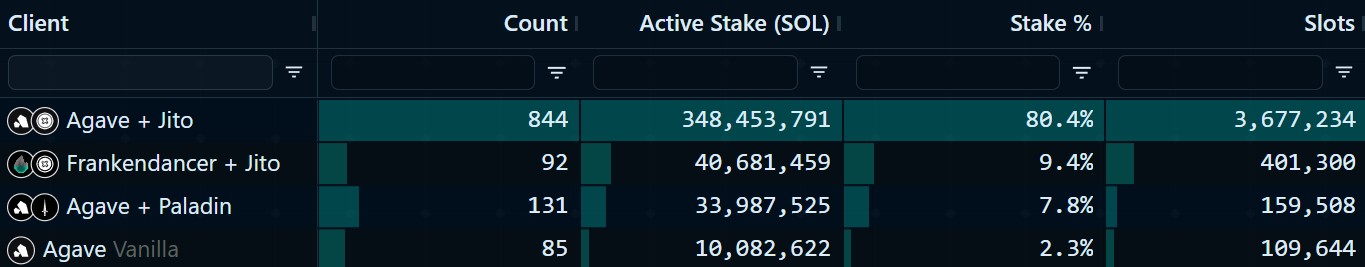 Solana currently supports two main validator client implementations: Agave and Firedancer. Agave is running on about 90% of validators as of Friday. Meanwhile, Firedancer is still in a transitional phase as Frankendancer, a hybrid combining Agave and Firedancer. It accounts for about 10% of validators, up from 7% in April.