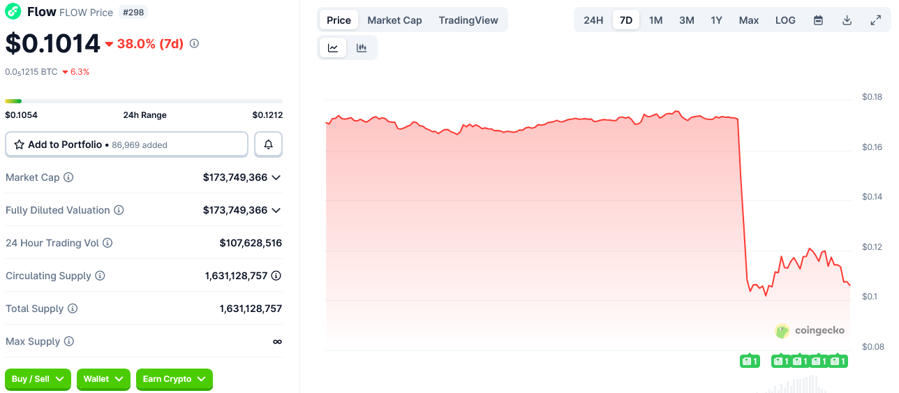 Around the same time, the Flow Foundation said the blockchain was expected to restart within the next four to six hours. The exploit and Flow’s rollback have driven the FLOW token down 42% since the attack, CoinGecko data shows.