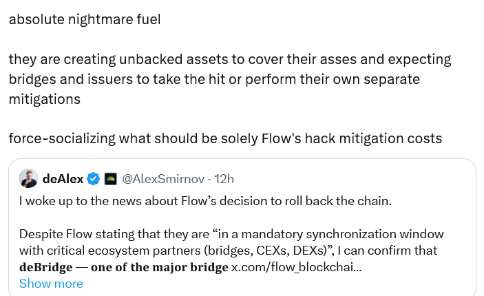 General counsel at crypto investment firm Delphi Labs Gabriel Shapiro also slammed Flow’s resolution approach, stating: “They are creating unbacked assets to cover their asses and expecting bridges and issuers to take the hit or perform their own separate mitigations.”