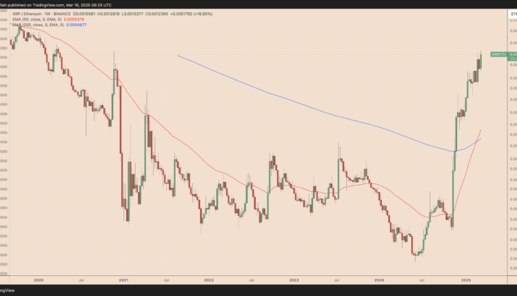 On March 15, the XRP/ETH pair touched 0.00128 ETH for the first time since April 2020. That amounts to a 925% rebound when measured from its all-time low of 0.00013 ETH established in June 2024 and approximately 620% gains since November 2024, when Donald Trump won the US presidential election.