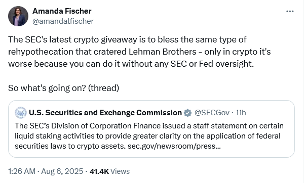 Former US Securities and Exchange Commission (SEC) chief of staff Amanda Fischer drew crypto community ire after comparing liquid staking to factors that exacerbated the 2008 global financial crisis.
