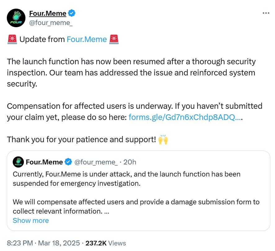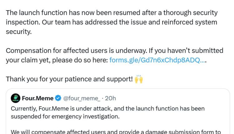 “The launch function has now been resumed after a thorough security inspection. Our team has addressed the issue and reinforced system security. Compensation for affected users is underway,” the Four.Meme team said.