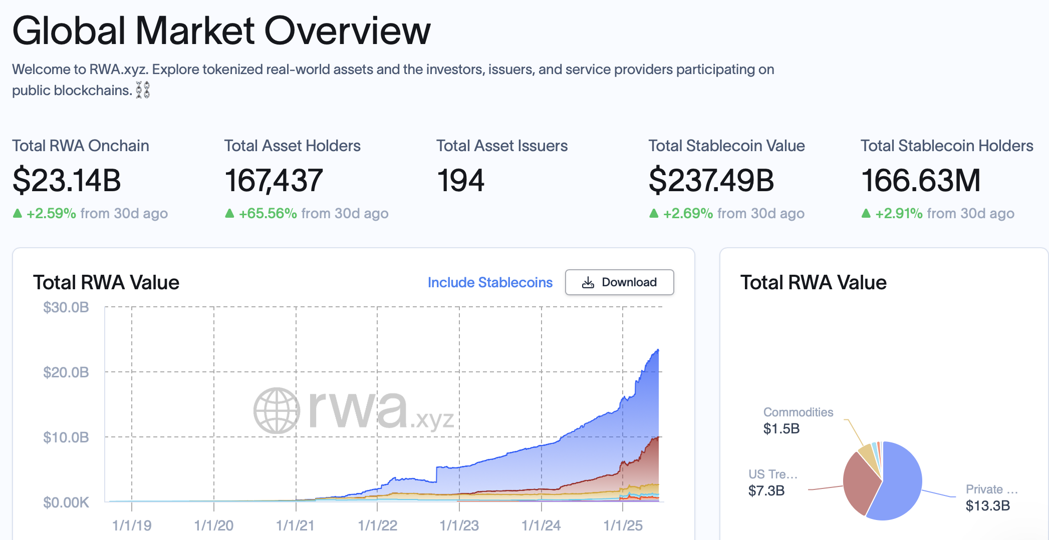 Tokenizable real-world, yield-bearing assets include debt instruments such as US Treasurys and corporate bonds, as well as equities issued by individual companies. According to RWA.xyz data, the market capitalization of tokenized assets reached $23.14 billion on June 9, up from $15.75 billion in early January, representing a 46.92% increase year to date.