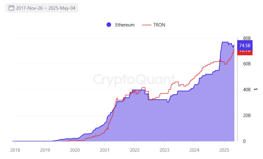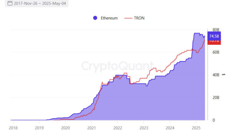 Tron was ahead of Ethereum for USDT circulation between July 2022 and November 2024, but a large $18 billion mint on Ethereum pushed the network ahead again, according to CryptoQuant.