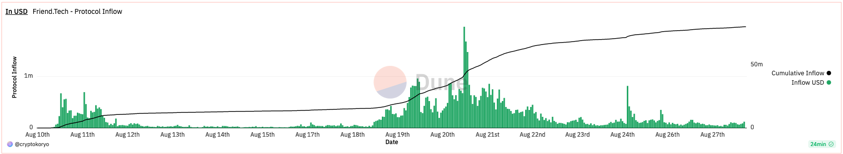 Dune shows inflows have also taken a dive from the Aug. 21 high of $16.8 million with Friend.tech seeing around $1.6 million on Aug. 27 — a nearly 90.5% decrease.