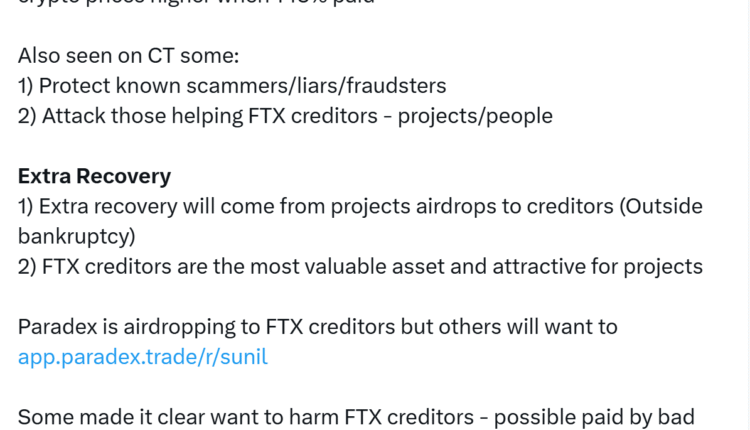 Sunil also pointed to the possibility of “extra recovery” through airdrops from external projects targeting FTX creditors. He cited Paradex as one such initiative, noting that “FTX creditors are the most valuable asset and attractive for projects.”