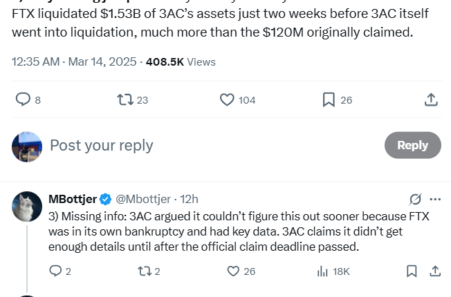 3AC “asked a bankruptcy court to let it increase its claim against FTX from $120 million to $1.53 billion,” according to “Mbottjer,” the pseudonymous co-founder of FTX Creditor, a group FTX creditors and bankruptcy claim buyers.
