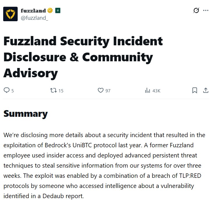 Smart contract analytics platform Fuzzland disclosed that a former employee was responsible for a $2 million exploit that targeted Bedrock’s UniBTC protocol in September 2024.