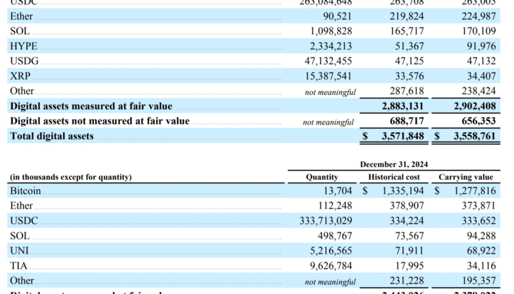 The firm’s total digital assets, including BTC, Ether (ETH), USDC (USDC), Solana (SOL) and XRP (XRP), reached $3.56 billion in carrying value. Bitcoin remained the largest single holding, making up over half of Galaxy’s fair value-measured assets.