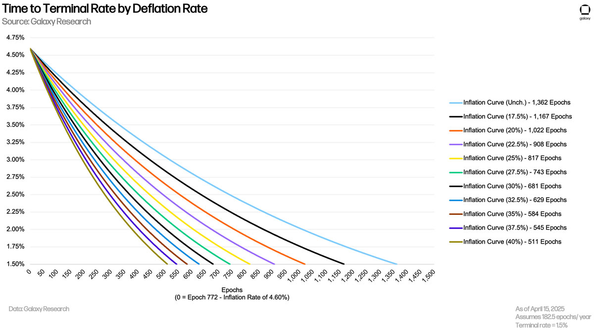 “Instead of cycling through inflation reduction proposals until one passes, what if validators could allocate their votes to one or many changes, with the aggregate of ‘yes’ outcomes becoming the adopted emissions curve?” Galaxy explained.