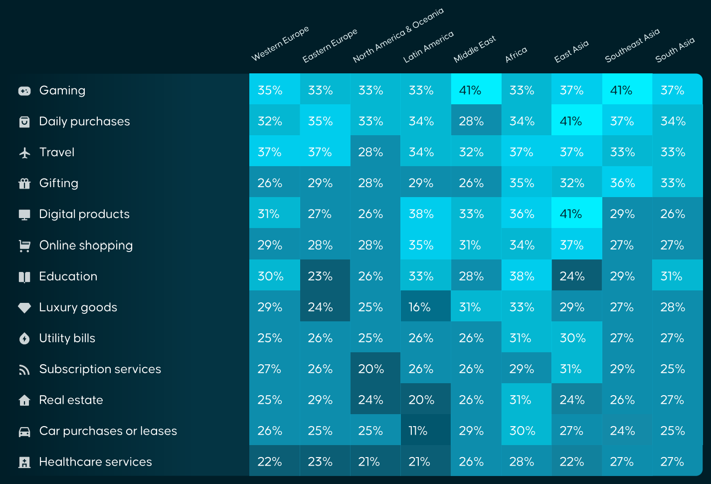 Southeast Asia leads in gaming and gifting, with 41% of users reporting interest in using crypto for these categories. In East Asia, crypto’s role in daily purchases and digital goods is most prominent, reaching 41% — the highest rate globally.