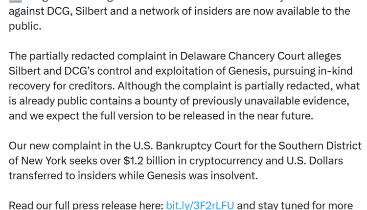 A second complaint, filed in the US Bankruptcy Court for the Southern District of New York, alleges that DCG and its affiliates withdrew over $1.2 billion in US dollars and cryptocurrencies during the year leading up to Genesis’s bankruptcy.