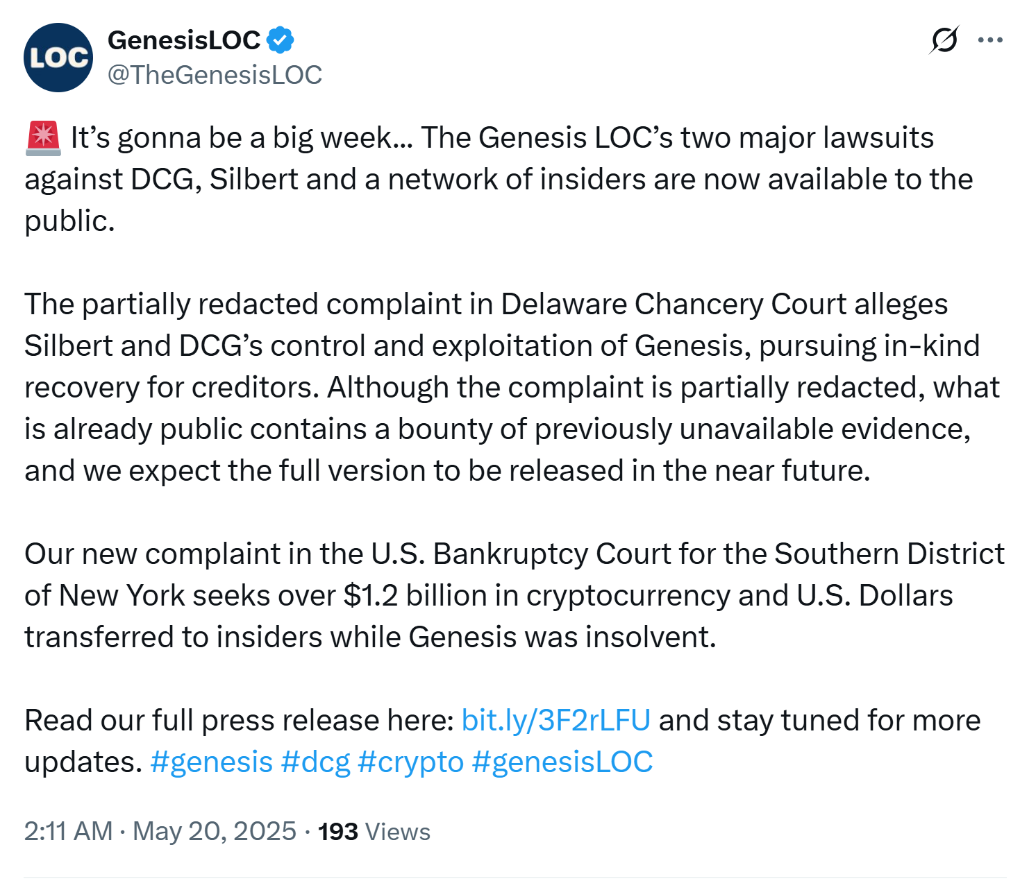 In total, Genesis is seeking to recover more than $3.3 billion through the two lawsuits.