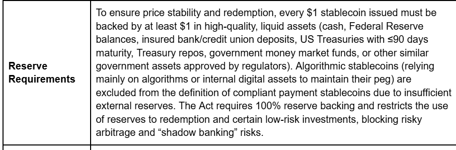 The Guiding and Establishing National Innovation for US Stablecoins (GENIUS) Act aims to set clear rules for stablecoin collateralization and mandate compliance with Anti-Money Laundering laws.