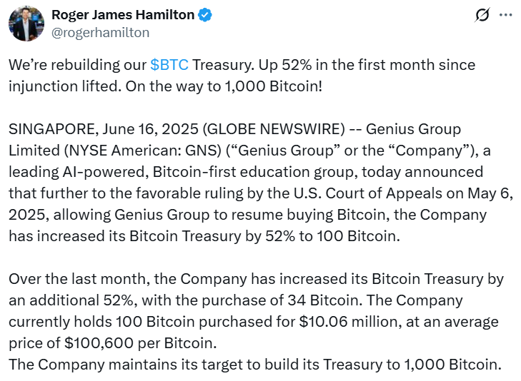 “We launched our Bitcoin Treasury in November 2025, and believe we were one of the first Bitcoin Treasury companies on the New York Stock Exchange (NYSE) American,” wrote Roger Hamilton, CEO of Genius Group, adding: