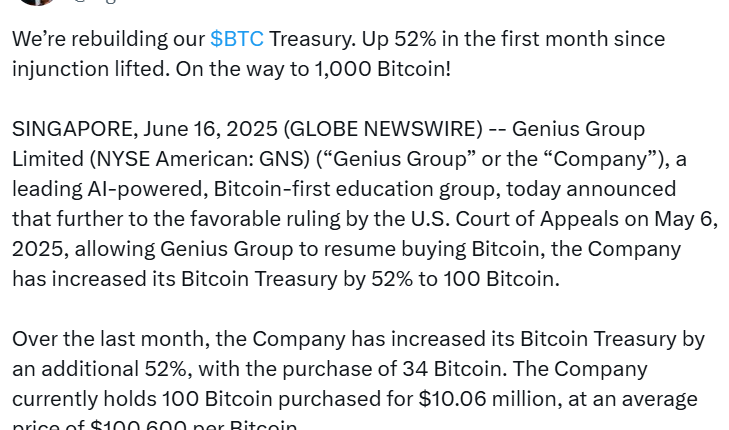 Despite a previous ban on the Nasdaq-listed firm’s corporate accumulation, Genius Group increased its Bitcoin (BTC) treasury by 52%, acquiring an additional 34 BTC during the past month.