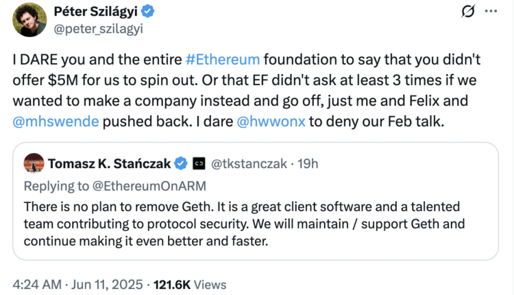 According to an X post by core developer Péter Szilágyi, the organization undermined the Geth development team in several ways, including encouraging the developers to work at other firms, proposing salary cuts and offering $5 million for the team to spin off into a private company. Szilágyi wrote in a Wednesday X post:
