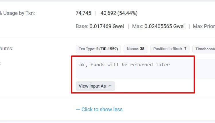 An onchain message from the GMX exploiter promising to return the funds. Source: Arbiscan