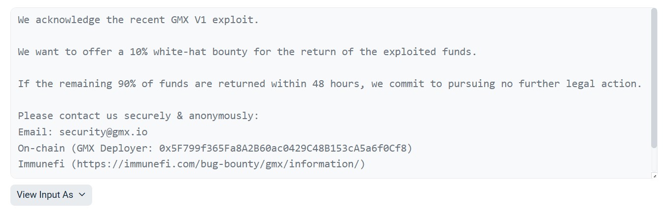 “You’ve successfully executed the exploit; your abilities in doing so are evident to anyone looking into the exploit transactions,” GMX wrote. “The white hat bug bounty of $5 million continues to be available.”