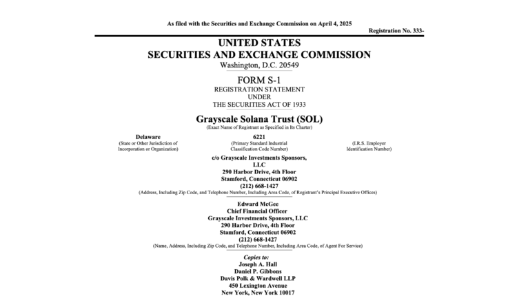 Digital asset manager Grayscale registered with the United States Securities and Exchange Commission (SEC) to list the Grayscale Solana (SOL) Trust exchange-traded fund (ETF) on the New York Stock Exchange (NYSE).