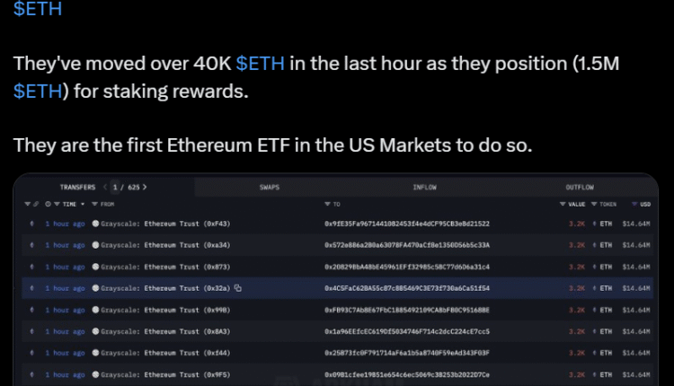 Onchain data from Arkham Intelligence showed Grayscale transferred more than 40,000 Ether (ETH) on Thursday, activity consistent with positioning for staking rewards. Arkham noted that if confirmed, Grayscale would be the first US Ethereum ETF sponsor to stake its holdings.