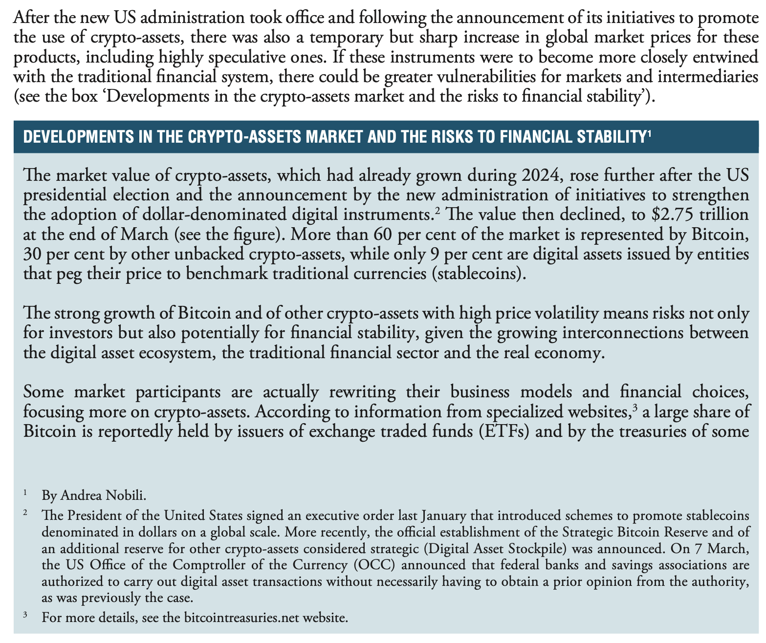 In its April 2025 Financial Stability Report, the Bank of Italy flags crypto volatility and rising integration with the broader economy, singling out stablecoins and non-financial firms’ crypto exposure as key concerns.