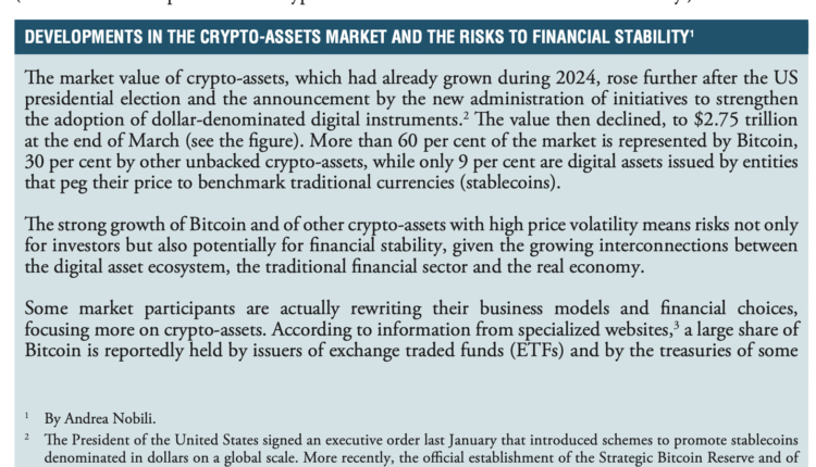 In its April 2025 Financial Stability Report, the Bank of Italy flags crypto volatility and rising integration with the broader economy, singling out stablecoins and non-financial firms’ crypto exposure as key concerns.