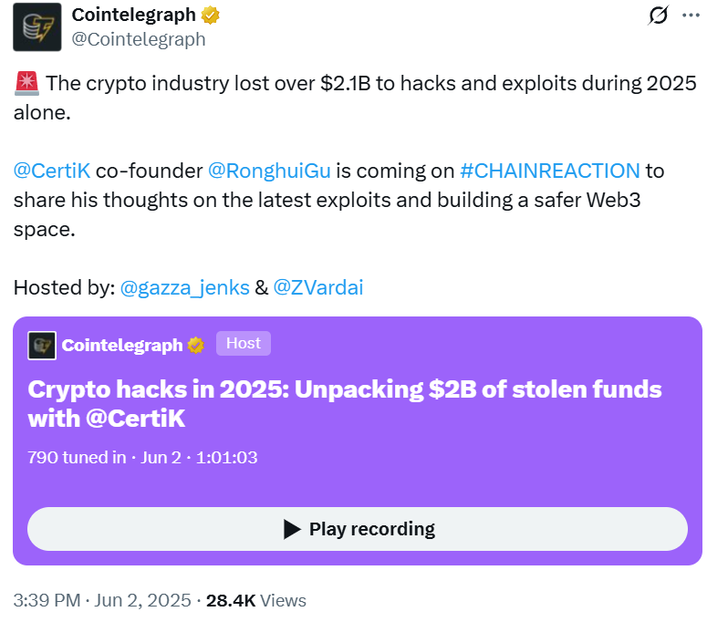 CertiK observed a shift in attack patterns from smart contracts and blockchain infrastructure vulnerabilities to exploiting loopholes in human behavior, Gu told Cointelegraph during the Chain Reaction daily X spaces show on June 2, adding: